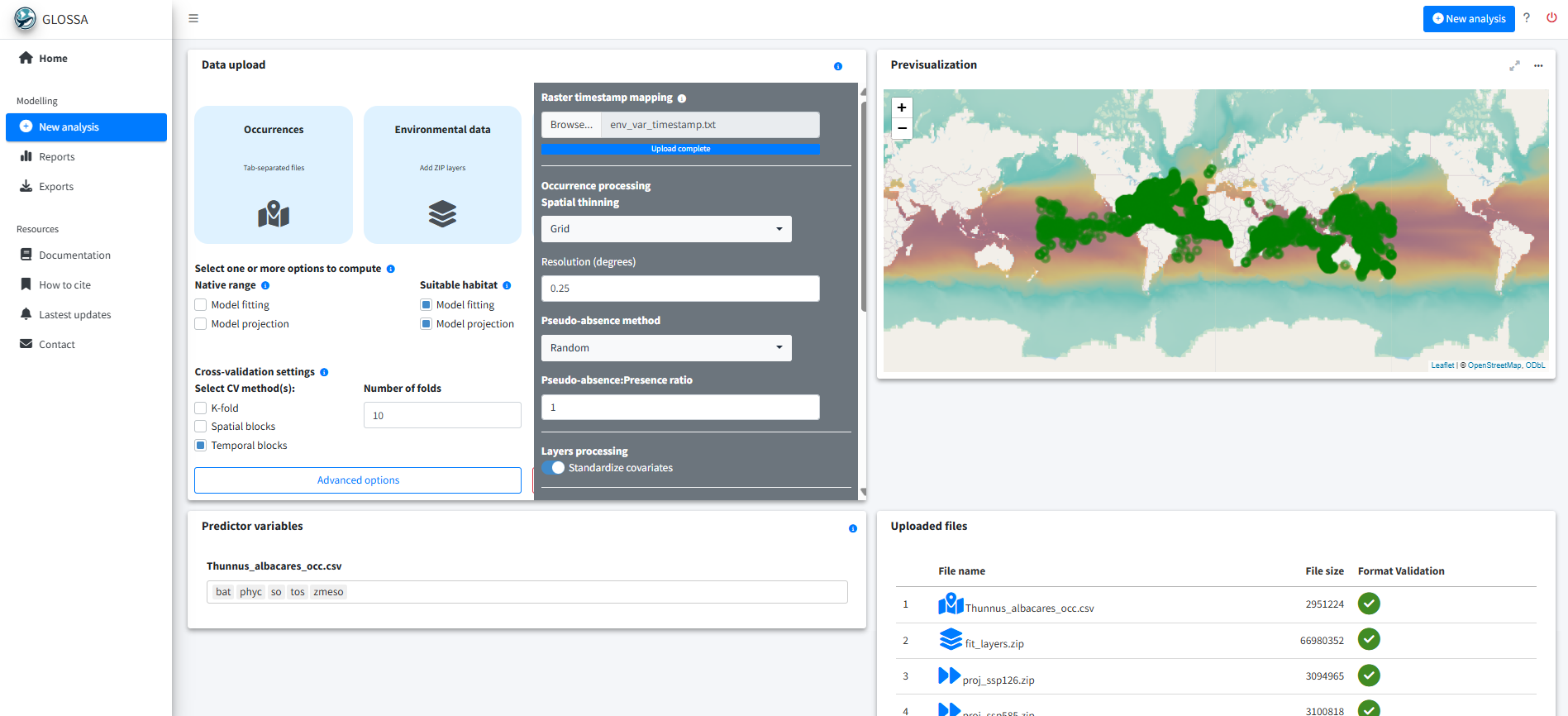 With the occurrence and environmental data prepared, we can now fit the habitat suitability model in GLOSSA.
