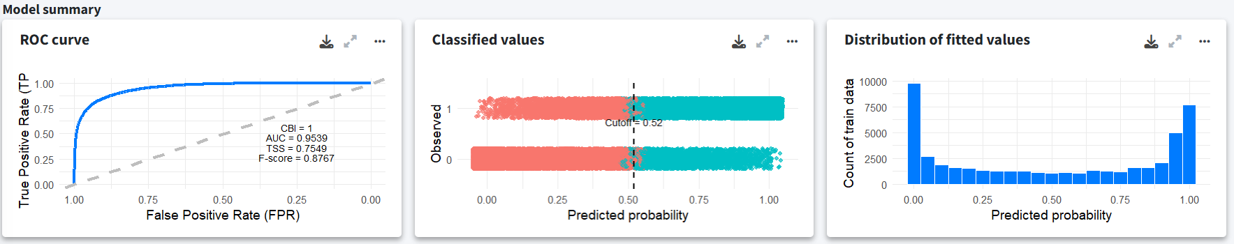 In the Reports section, we explore the model outputs and projections for both climate scenarios (SSP1-2.6 and SSP5-8.5). The model was fit using a total of 24,349 presence records. The model summary shows decent performance with high AUC and Continuous Boyce Index (CBI) values. The middle plot shows the optimal classification cutoff based on the True Skill Statistic (TSS) and the rightmost plot displays the distribution of fitted values.