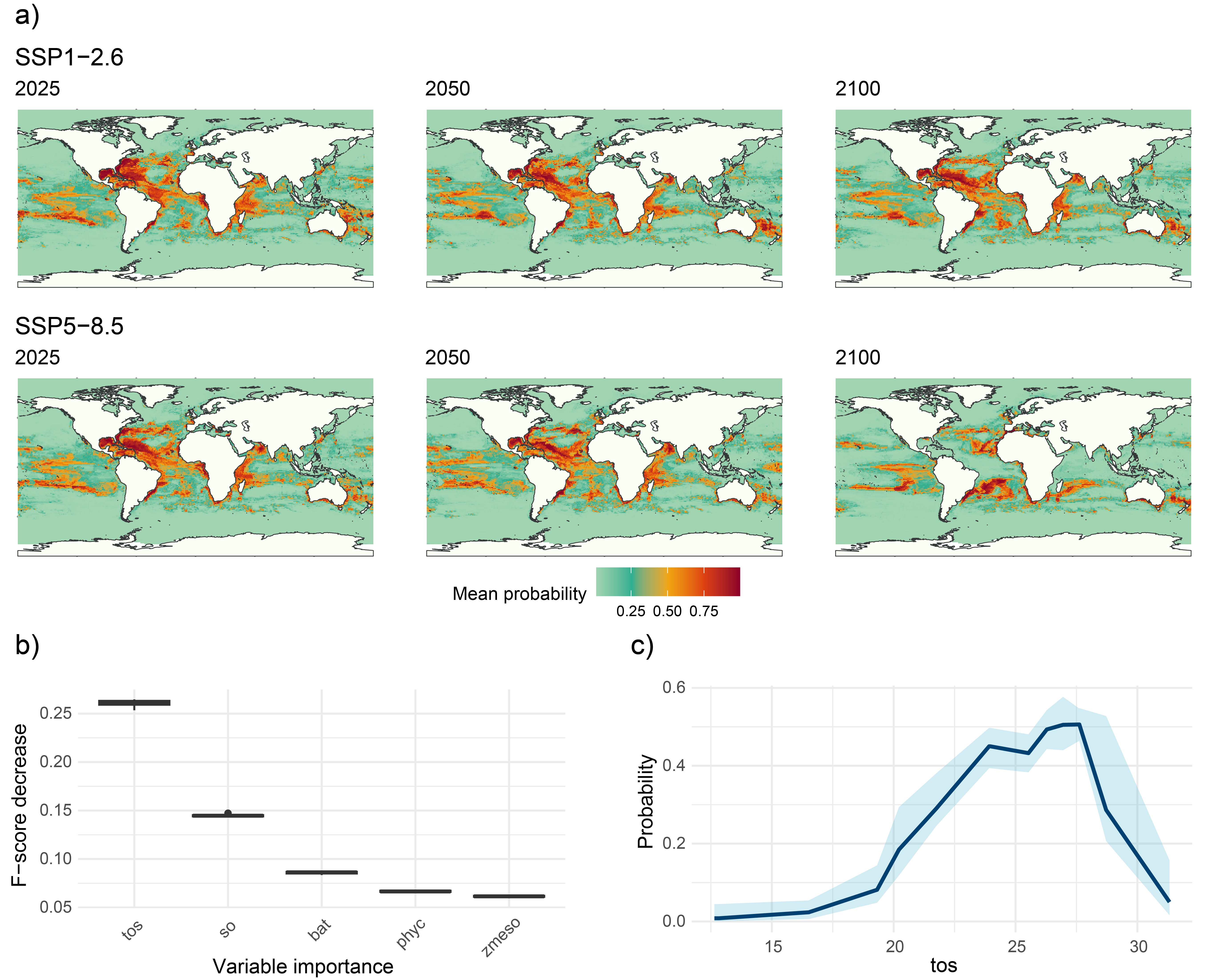 Finally, we have computed the response curve for each predictor variable. The response curve for sea surface temperature indicates that the probability of species presence peaks at around 25°C, illustrating the species’ preference for moderate water temperatures. As temperatures deviate from this optimal range, the probability of occurrence declines sharply, underscoring the species’ vulnerability to temperature changes.