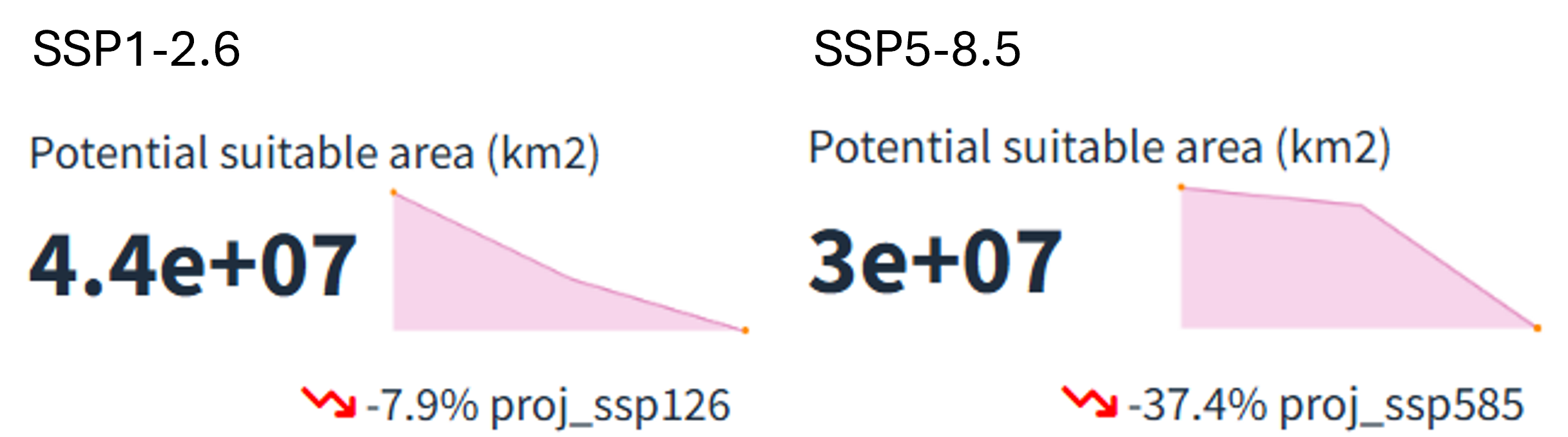 After selecting the desired climate scenario in the GLOSSA predictions box, we can view the evolution of the potential suitable area over time for the projected layers (2025, 2050 and 2100) in the top section. For both climate scenarios, a reduction in the potential suitable habitat area (\(km^2\)) is evident, with a more pronounced decline under the high-emission scenario (37.4% reduction) compared to the low-emission scenario (7.9% reduction).