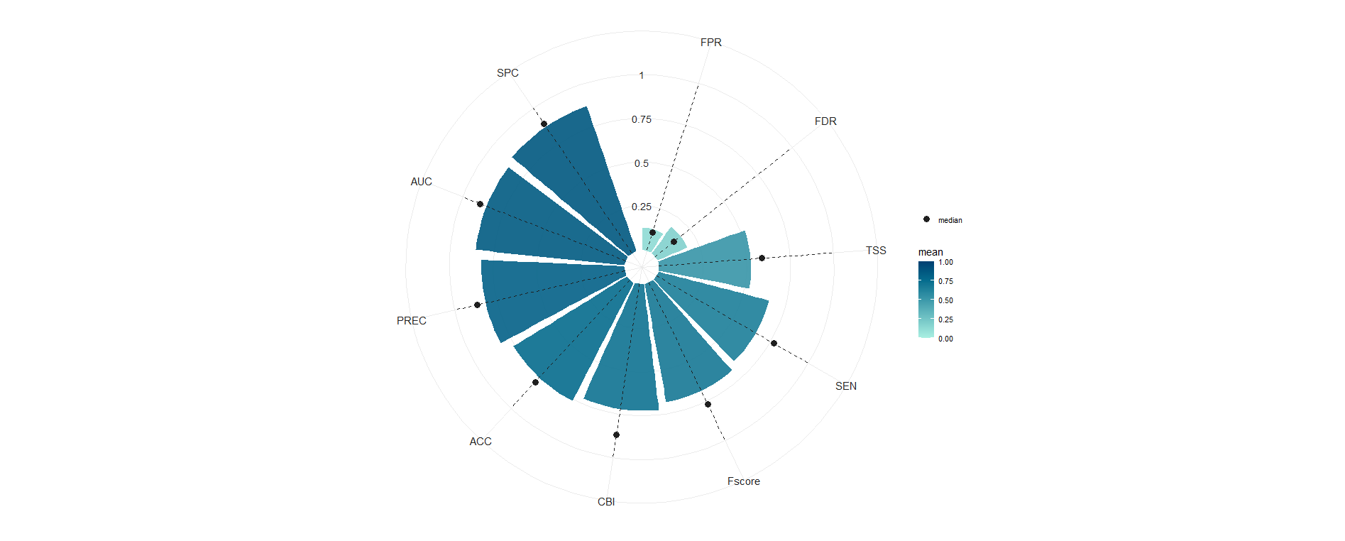 In order to test the model with more independent data to check if we are overfitting the presences we used a temporal block cross-validation. We see that while the TSS seems low, the AUC and the precision of the presences is high indicating it finds presences where they should be, but the sensitivity is a bit lower with a median value around 0.75, indicating that some presences are not detected, highlighting a more conservative model behavior. This is reflected in the F-score and TSS. However, when working with a presence-only model with pseudo-absences, these metrics can be misleading as we don’t have real absences and we are not modelling the probability of presences as our pseudo-absences represent the availability. In such cases, there are more appropriate metrics designed for these cases such as the CBI, that in this case shows a median value of 0.87.