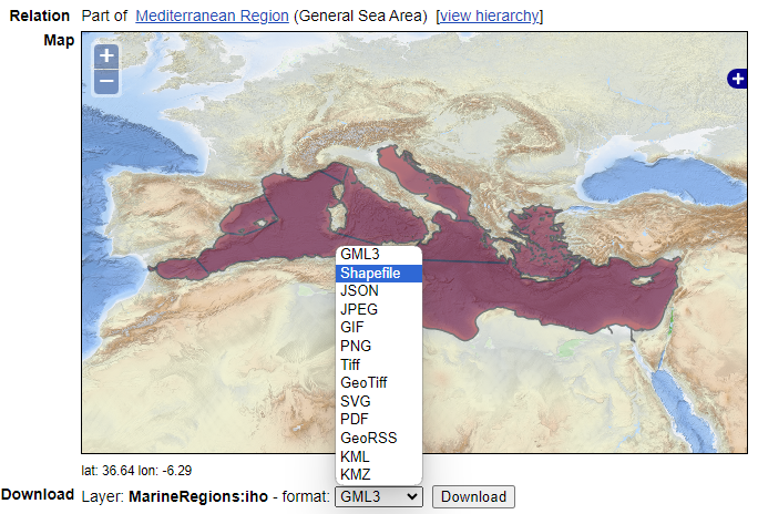 To restrict the analysis to the Mediterranean Sea, we use a polygon defining the region, since the environmental layers extend beyond its boundaries. The shapefile can be obtained from the Marine Regions repository. The specific download link for the Mediterranean Sea polygon can be found here.