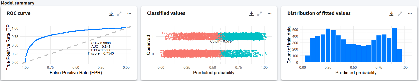 The fitted model summary indicates a good fit with high CBI, AUC and F-score values. Also, the distribution of fitted values doesn’t show very extreme values, suggesting there is no overfitting. Note that the model was fitted using randomly generated pseudo-absences rather than real absences.