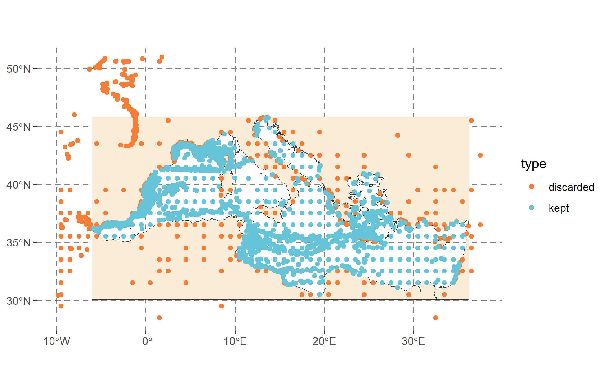 package to download the occurrences. To restrict the download to the Mediterranean Sea, we use the pred_within()