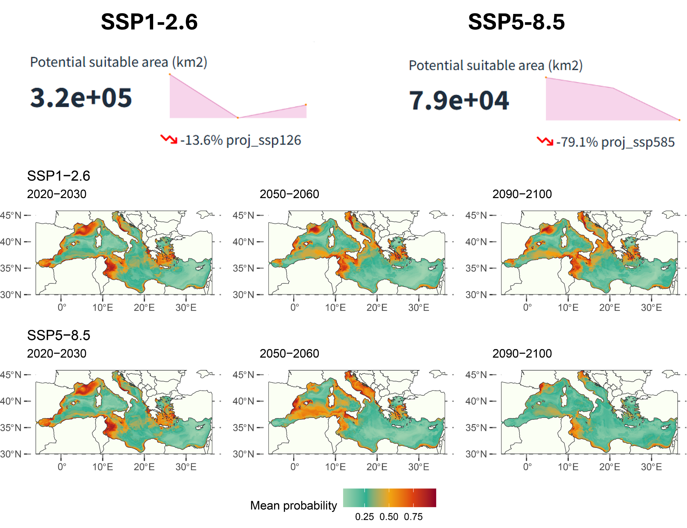 For the climate projections, there is a predicted decrease of 13.6% in suitable habitat area (\(\text{km}^2\)) in the SSP1-2.6 scenario and about 79.1% in the SSP5-8.5 scenario from the 2020s to the 2090s. The western Mediterranean and the Adriatic Sea are projected to have relatively better habitat suitability.