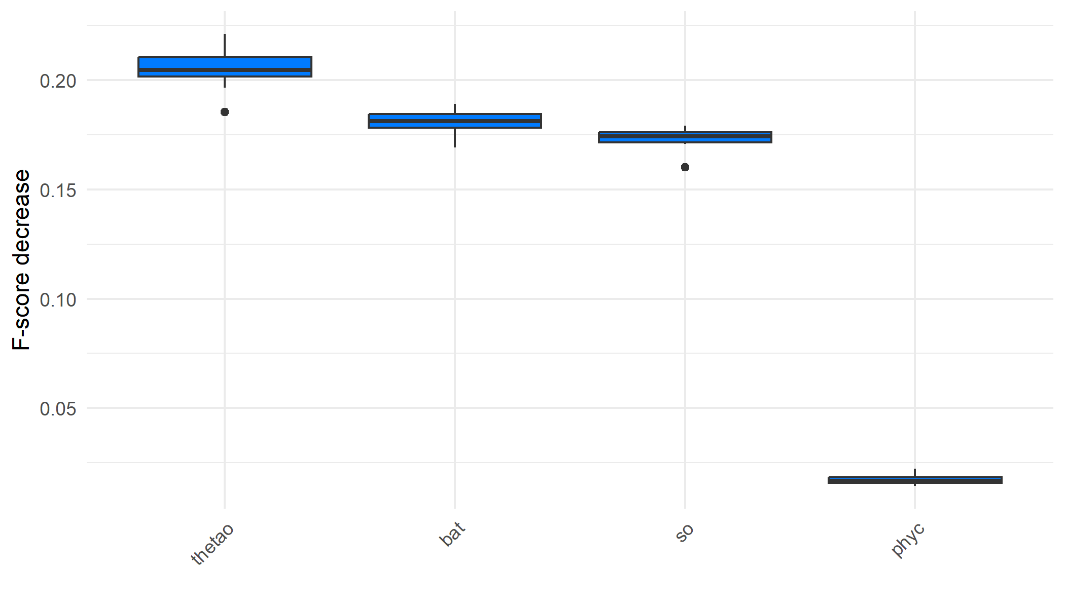 We can also determine which predictors play a more significant role in predicting the outcome by examining the variable importance plot. This plot shows the decrease in model F-score using permutation feature importance, which measures the increase in prediction error after shuffling the predictor values. Sea surface temperature was the most important predictor, followed by bathymetry. Sea turtles live their entire lives in the ocean, but they migrate to nest on coastal land, with their sex being determined by the temperature during incubation (Mancino et al., 2022).