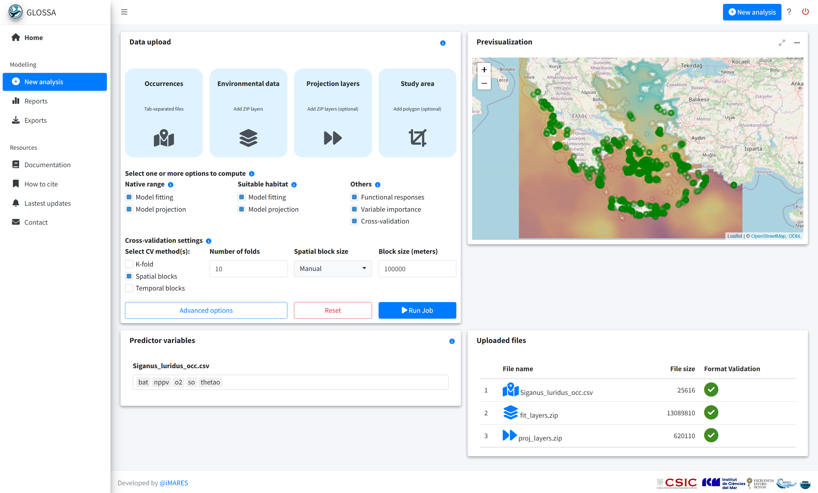 We upload the occurrence file for S. luridus and the environmental layers for model fitting and projection (in this case, the year 2020). To estimate the native range and suitable habitat, we selected the Model fitting and Model projection options for both the Native range and Suitable habitat models. Additionally, we enabled Functional responses, Variable importance and Cross-validation in the Others section.