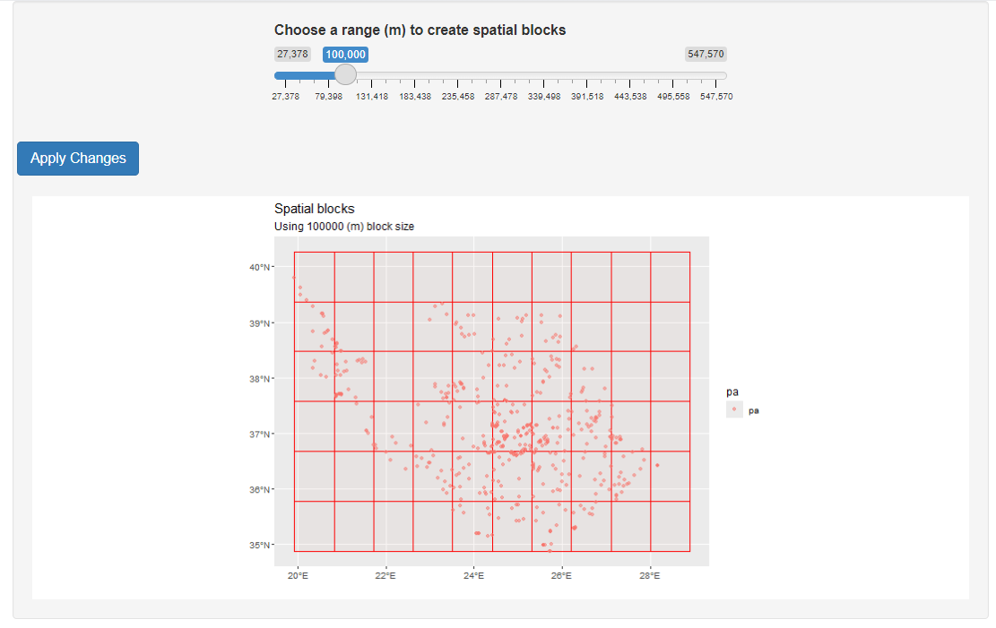 To evaluate model performance, we applied spatial block cross-validation with 10 folds. On a first attempt we determined block size using the range of the spatial autocorrelation of the residuals. However, block size was very small (~11 km) so we decided to increase the block size manually to 100 km. For assisting this process we used the cv_block_size()