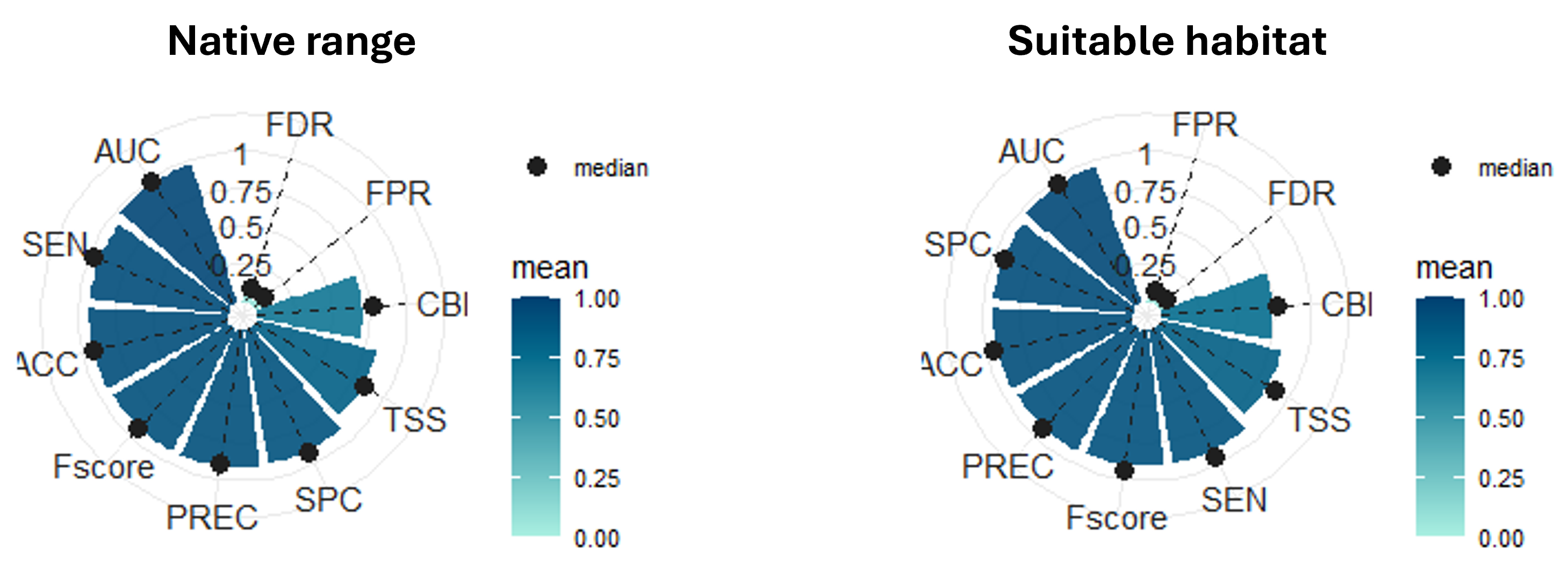 To assess the predictive performance, we applied a 10-fold spatial-block cross-validation. The evaluation metrics indicate overall solid performance, with high AUC and precision. The F-score and TSS also suggest that the model is well balanced. However, as we are working with pseudo-absences and not real absences, these metrics should be interpreted with caution. For this reason, we also computed the Continuous Boyce Index (CBI), which is a presence-only metric that ranges from −1 to 1, where values close to zero indicate that the presence predictions are not better than those from a random model. In this case, the CBI is moderate, which is expected due to the large size of the spatial blocks used in the cross-validation. These blocks impose strong independence constraints on validation data and may force the model to extrapolate on new environmental conditions. Although the model could be improved by refining covariates or using target-group pseudo-absences, the current model fits our purpose as we are not aiming to extrapolate far beyond the study area.