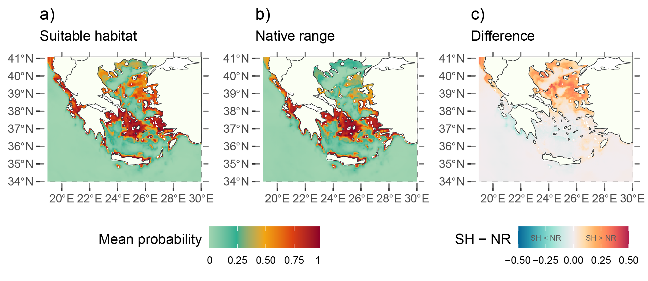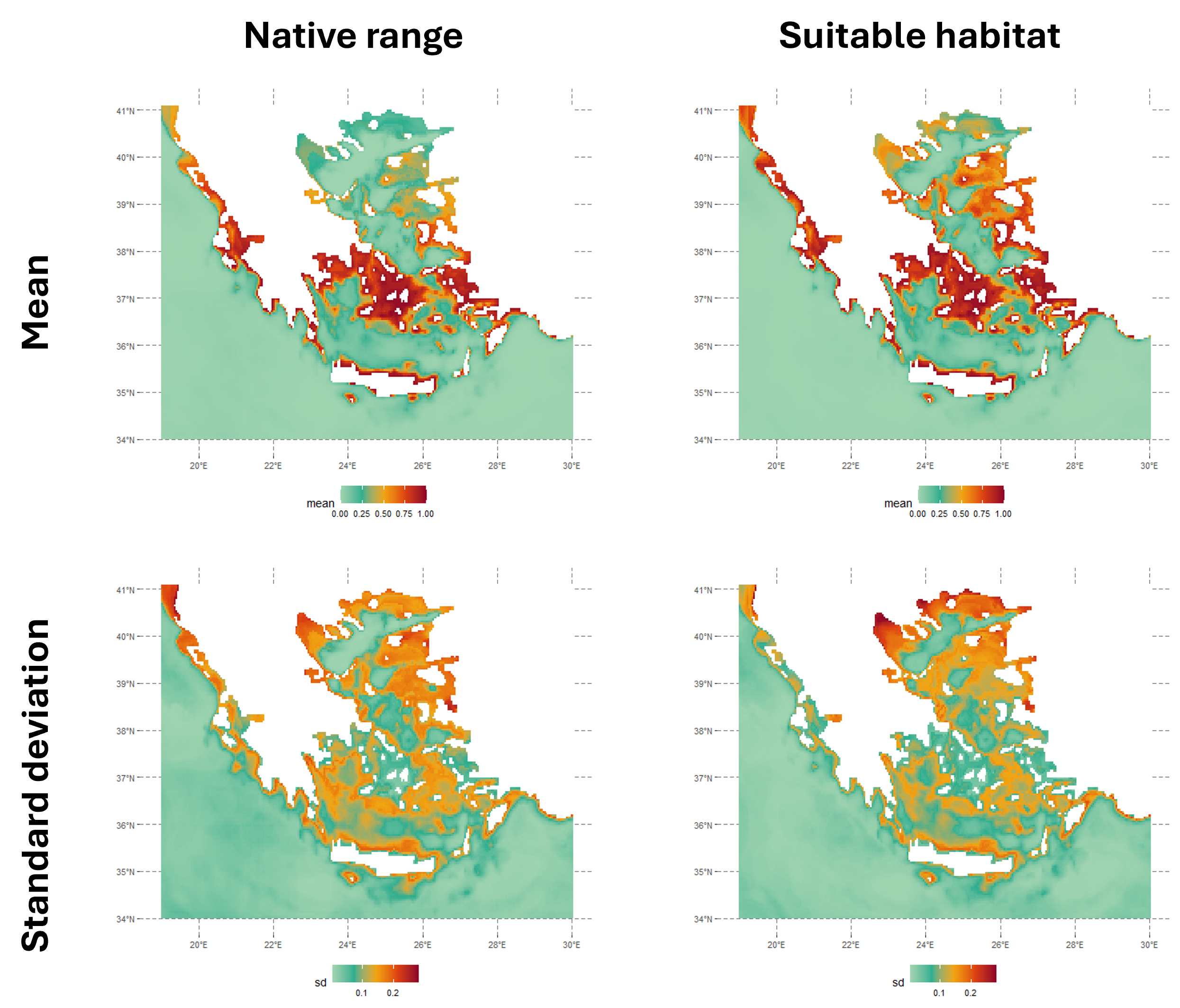For example, the Thracian Sea and northeast Aegean islands were identified as high-risk areas for potential invasion, even though the species is not currently established there according to the predicted native range in 2020. However, uncertainty is high in the Thracian Sea predictions as the environmental conditions are outside the range of the ones matching the occurrence records. Moreover, suitable environmental conditions do not guarantee that the species will establish; there are dispersal limitations, biotic interactions and barriers that could prevent invasion.