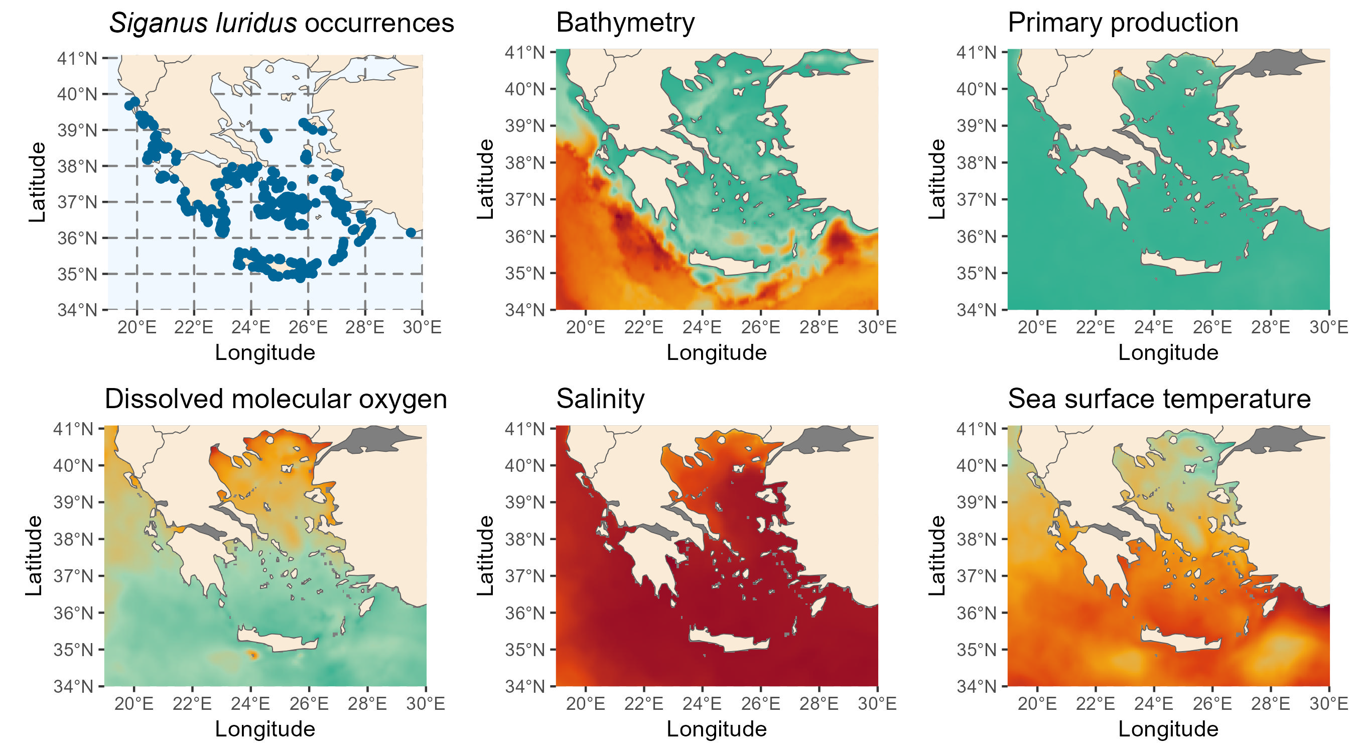 This example shows how to use GLOSSA to predict the suitable habitat of Siganus luridus in the Greek Seas and identify potential areas at risk of invasion. S. luridus is one of the many Lessepsian species that have entered the Mediterranean through the Suez Canal, posing challenges to native species, which makes it crucial to predict their potential spread to inform management strategies (Solanou et al., 2023).