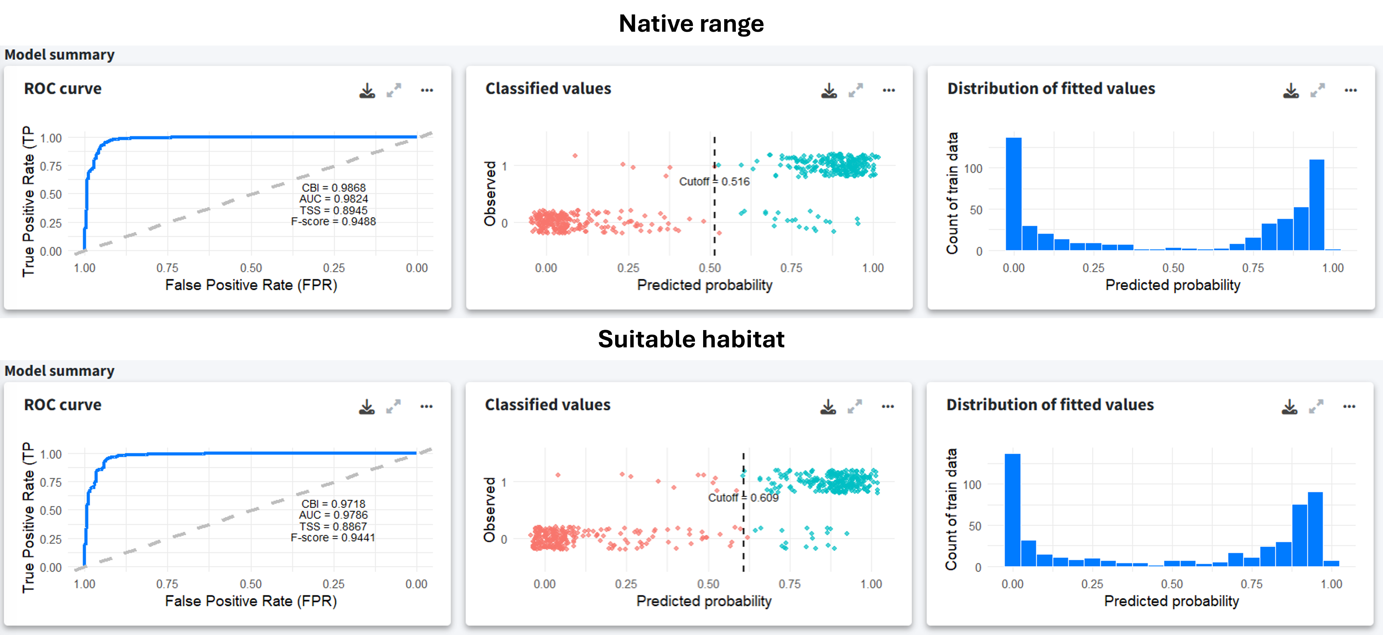 Despite the data limitations, the model summary indicates good performance, with clear classification between presences and pseudo-absences for both models.